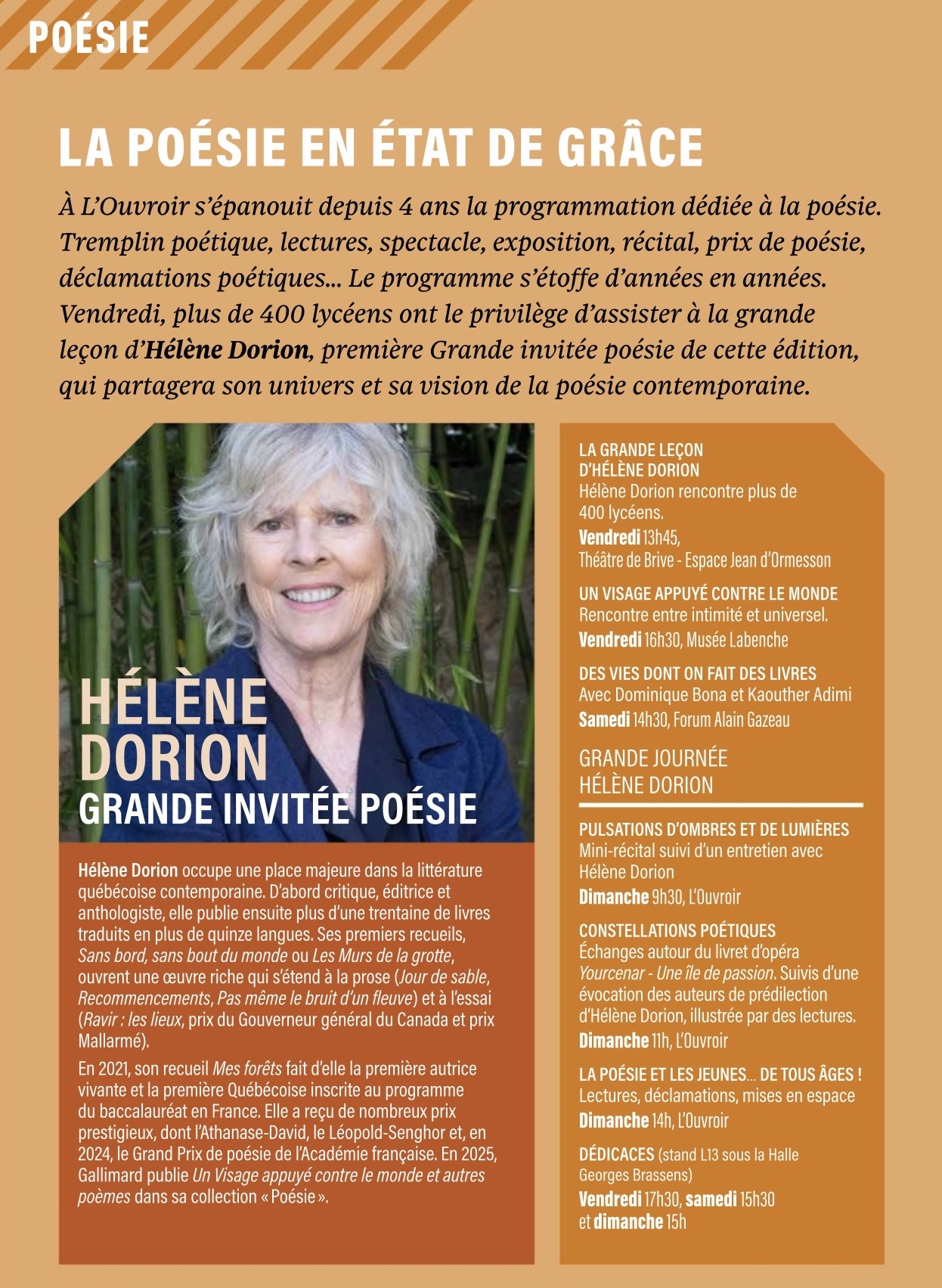 Samedi 6 avril à 14h00, dans le cadre du Festival des littératures contemporaines à Laval, entretien intitulé « Hélène Dorion, une manière d’être au monde », suivi d’une séance de dédicaces.